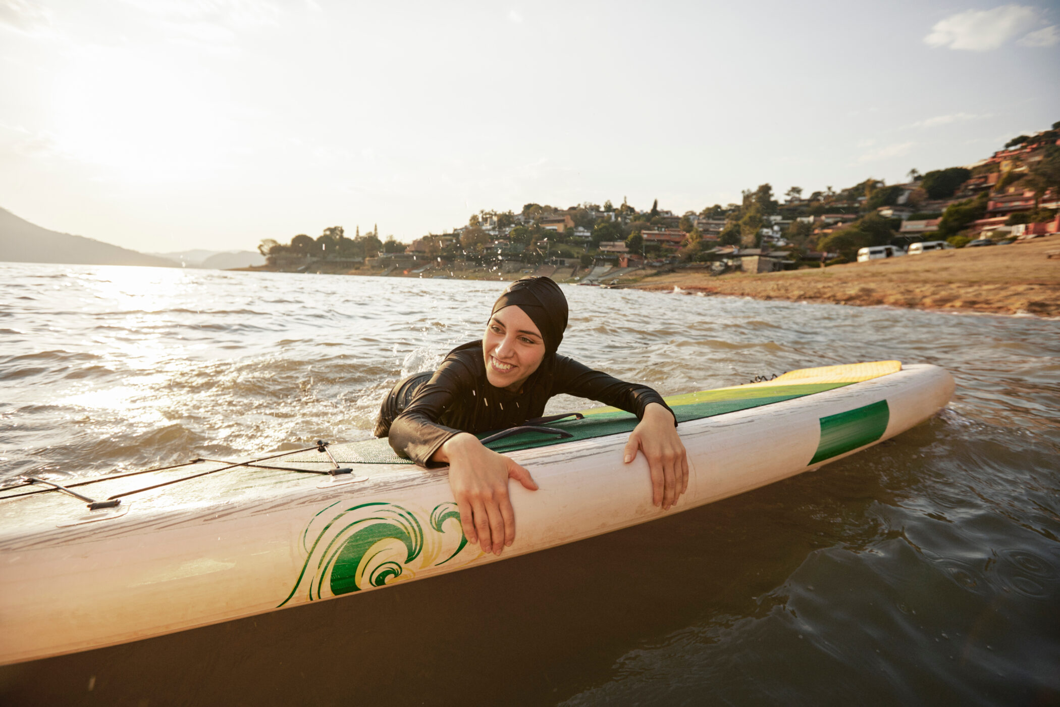 Smiling young woman leaning on paddleboard in lake ⋆ Globetrender